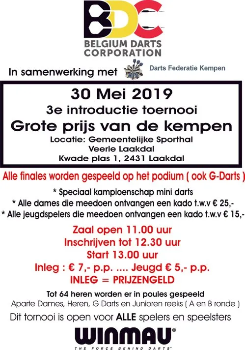 Ter introductie van de Belgium Darts Corporation zal op 30 mei in Laakdal (België) een derde toernooi worden georganiseerd genaamd 'Grote prijs van de Kempen'. Dit ligt op slechts 30 km van de Nederlandse grens.