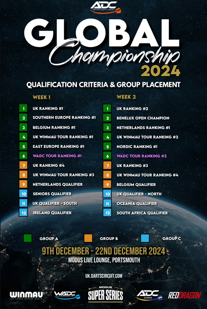 De deelnemers aan het ADC Global Championship worden geselecteerd op basis van verschillende ranglijsten en kwalificatietoernooien. De top vier spelers van de ADC UK Ranking en de UK Winmau Tour krijgen een directe uitnodiging. Daarnaast zullen de beste spelers uit Zuid-Europa, België, Oost-Europa, Nederland en Noord-Europa ook een plek bemachtigen. Ook de kampioen van de Benelux Open krijgt een ticket naar Portsmouth.