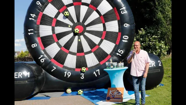 Wie had gedacht dat je dat zou gaan roepen bij een voetbalspel? Bij dit unieke spel kan het! Voetbaldarts combineert voetbal met de puntentelling en het scorebord van darten. Een wereldwijd populair spel dat zeker in de smaak zal vallen bij zowel kinderen als volwassenen. Bezorg jouw dag met een unieke beleving met Voetbaldarts.