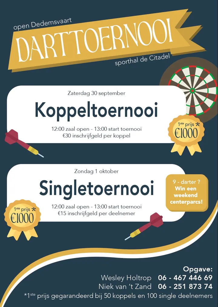 Darttoernooi zijn geopend. Het toernooi vindt plaats in Sporthal de Citadel te Dedemsvaart. Spelers als Ron Meulenkamp, Moreno Blom, Arjan Konterman & Martijn Dragt hebben zich al ingeschreven, ben jij er ook bij?