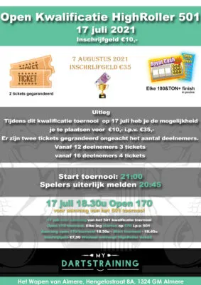 De locatie is open vanaf 12.00u. Om 18.30u vangt een Open-170 toernooi aan waarbij de winnaar een HighRoller ticket voor 7 augustus ontvangt. Hier wordt beneden meer over uitgelegd. Aanstaande zaterdag vangt dus aan met een warming-up of een ieder die het leuk lijkt mee te doen aan een toernooi wat start op 170 i.p.v. 501