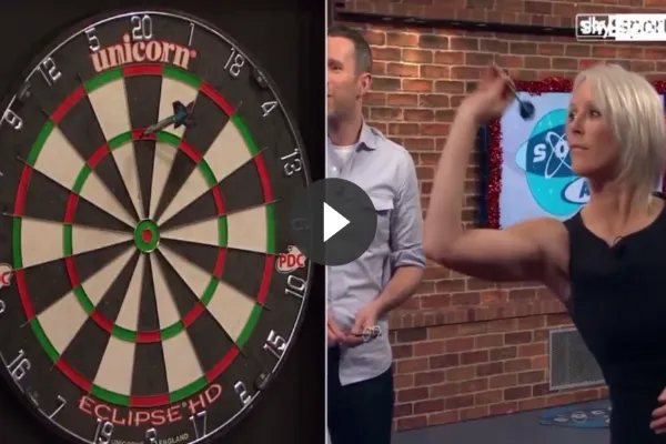 Tijdens een opname voorafgaand aan het PDC WK werd presentatrice Helen Chamberlain uitgedaagd voor een spelletje darts.