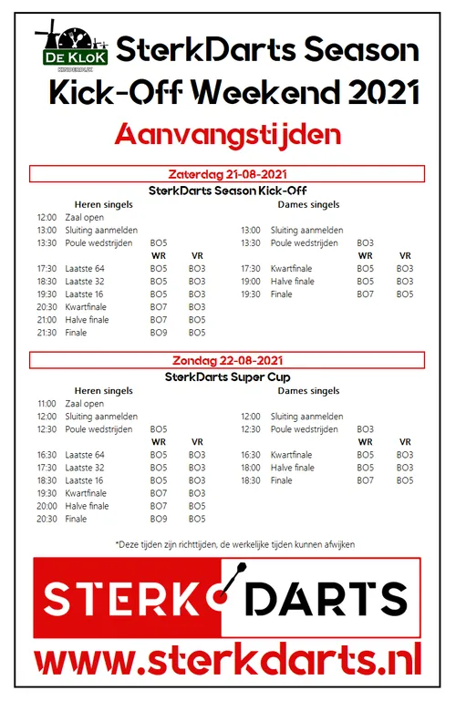 We hebben er bijna een jaar op moeten wachten maar langzaamaan komt het moment dat ook het SterkDarts seizoen weer begint steeds dichterbij. Het seizoen gaan ze starten op 21 en 22 augustus in de thuisbasis van SterkDarts, namelijk De Klok Kinderdijk. Het komend jaar gaan ze het hele land door. Zo gaan ze naar Zeeland, Limburg, Friesland, Overijssel, Drenthe, Noord-Brabant en maken ze waarschijnlijk zelfs een aantal uitstapjes naar België. Maar de start en eind van het seizoen liggen in Kinderdijk in De Klok. Twee dagen worden er singletoernooien gehouden tijdens het SterkDarts Season Kick-Off Weekend. Beide dagen heren singels en dames singles. Op zaterdagmiddag de SterkDarts Season Kick-Off en op zondag de SterkDarts Super Cup. Deelname is mogelijk voor iedereen en dubbele punten voor de SterkDarts Ranglijst.