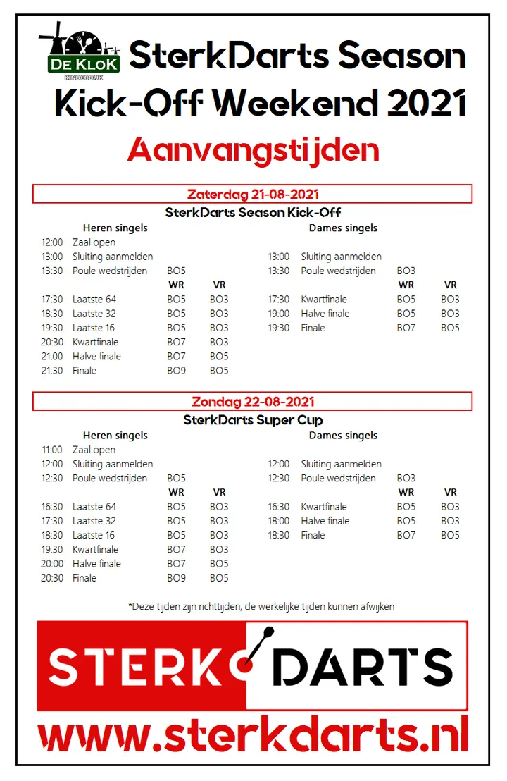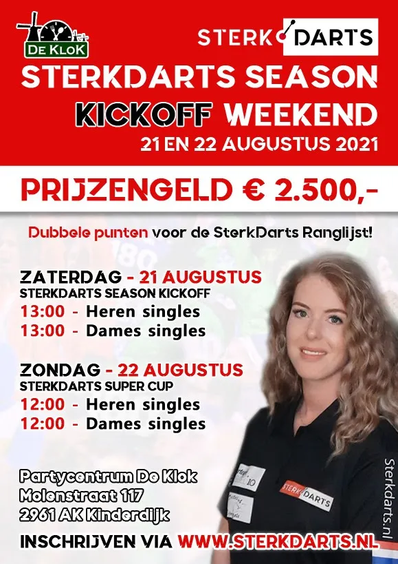SterkDarts seizoen weer begint steeds dichterbij. Het seizoen gaan ze starten op 21 en 22 augustus in de thuisbasis van SterkDarts, namelijk De Klok Kinderdijk. Het komend jaar gaan ze het hele land door. Zo gaan ze naar Zeeland, Limburg, Friesland, Overijssel, Drenthe, Noord-Brabant en maken ze waarschijnlijk zelfs een aantal uitstapjes naar België. Maar de start en eind van het seizoen liggen in Kinderdijk in De Klok. Twee dagen worden er singletoernooien gehouden tijdens het SterkDarts Season Kick-Off Weekend. Beide dagen heren singels en dames singles. Op zaterdagmiddag de SterkDarts Season Kick-Off en op zondag de SterkDarts Super Cup. Deelname is mogelijk voor iedereen en dubbele punten voor de SterkDarts Ranglijst.