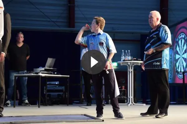 Phil Taylor. De pas 13-jarige wist Phil Taylor namelijk te verslaan op het podium tijdens de Hessen Darts Championships zoals te zien is op .