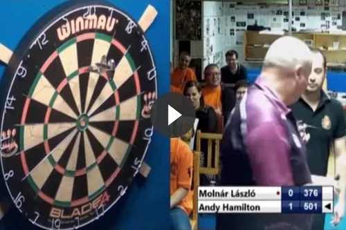Tijdens een demotoernooi in Hongarije wist Andy Hamilton een mooie prestatie te leveren door een 180-er te gooien zoals je hem nog nooit zag. Nadat de eerste twee pijlen in de triple 20 werden gegooid draaide hij zich om en kreeg de pijl van zijn tegenstander. Zonder te twijfelen legt hij aan om zijn 180 compleet te maken zoals je .