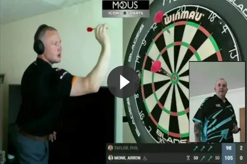 Zondagavond stonden Arron Monk en Phil Taylor tegenover elkaar op de Modus Champions Series. De voormalig wereldkampioen bij de jeugd leek het niet al te serieus te nemen en probeerde enkele demo-shots. Het was misschien niet verstandig om dit uitgerekend tegen de 16-voudig wereldkampioen te doen. Desondanks slaagde hij wel in één prachtige checkout. Deze opmerkelijke finishes en de verbaasde reactie van The Power zijn .