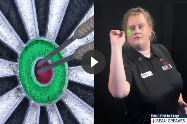 We hebben de grote mannen weleens 3 bull's eyes in één beurt zien gooien maar wat de pas 19-jarige nu flikt hebben we een man nog nooit zien doen en dit is te bekijken op