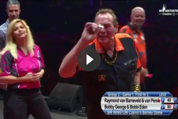 Raymond van Barneveld afscheid met zijn eigen evenement BarneyDome. Inmiddels zijn er nieuwe beelden online verschenen van dit toernooi en één van de hoogtepunten brengen we hieronder. Bobby George vormde een duo met Bobbi Eden en in hun duel tegen Raymond van Barneveld en Robin van Persie wist Mister Glitter een finish te gooien die we nog niet eerder zagen. Hij kreeg de lachers op zijn hand met onderstaande bijzondere checkout tegen de latere winnaars van het toernooi.