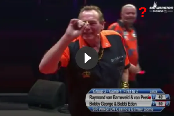 Raymond van Barneveld wist Mister Glitter de Nederlander te verrassen toen hij via een nogal ongebruikelijke route een 50-finish gooide zoals te zien is op
