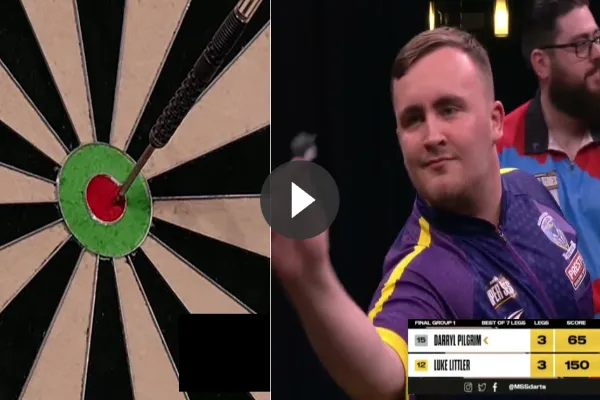 Bekijk hoe hij de ene na de andere finish gooit die je normaal alleen op demo-avonden ziet. Er kwamen maar liefst 5 bulls-eyes op rij bij kijken zoals te zien is op