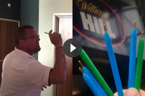 Steve West een oplossing voor. Hij bewijst namelijk dat je ook eenvoudig een potje kan darten met een paar plastic pennen zoals te zien is op