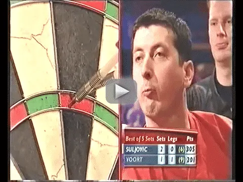video op internet op waarop beelden van 15 jaar geleden worden getoond. In de eerste ronde van de Lakeside 2002 speelden Suljovic en Van der Voort tegen elkaar en wat blijkt, Mensur Suljovic gooide destijds sneller dan