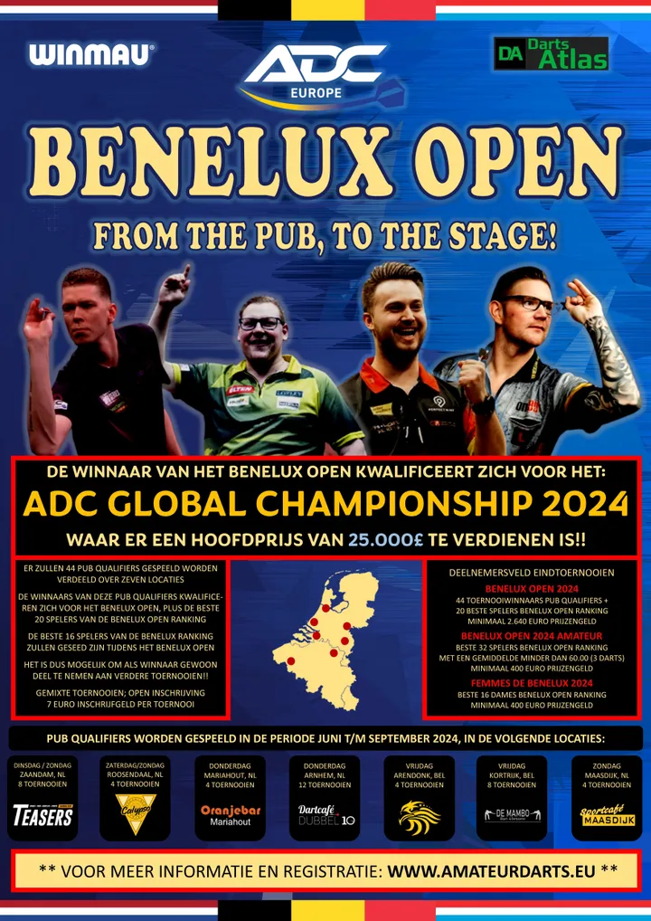 Het ADC Benelux Open zal zaterdag 5 oktober 2024 gespeeld worden in Sportcafé Maasdijk te Maasdijk, daar heeft men zich tijdens de zomerperiode voor kunnen kwalificeren via de Pub Qualifiers. De dag na het ADC Benelux Open, zondag 6 oktober 2024, zal er op dezelfde locatie de ADC Global Championship Qualifier gespeeld worden speciaal voor ADC Europe leden. Mocht men nog geen ADC Europe lid zijn en wilt men toch kans maken om zich te kwalificeren voor de ADC Global Championship, dan is dit gewoon mogelijk. Wordt lid van ADC Europe en schrijf je in voor de Qualifier.