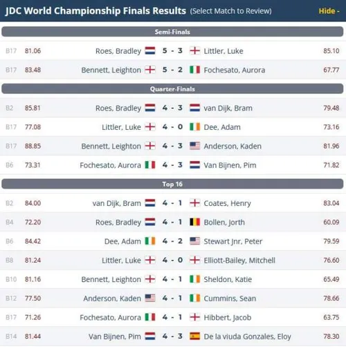 Bradly Roes zal de finale van de JDC Junior World Darts Championships Finals spelen tegen Leighton Bennett. De Nederlander slaagde er als enige in deze week om Luke Littler te verslaan die gisteren ook al gooide.