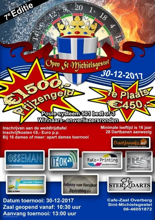 Volgende week zaterdag 30 december 2017 staat alweer de 7de editie van DE afsluiter van het dartjaar, Open St. Michielsgestel op het programma. Met eerdere winnaars als Benito v.d. Pas, Jermaine Wattimena en in 2016 Dimitri v.d. Bergh staat dit toernooi goed op de dartkaart.