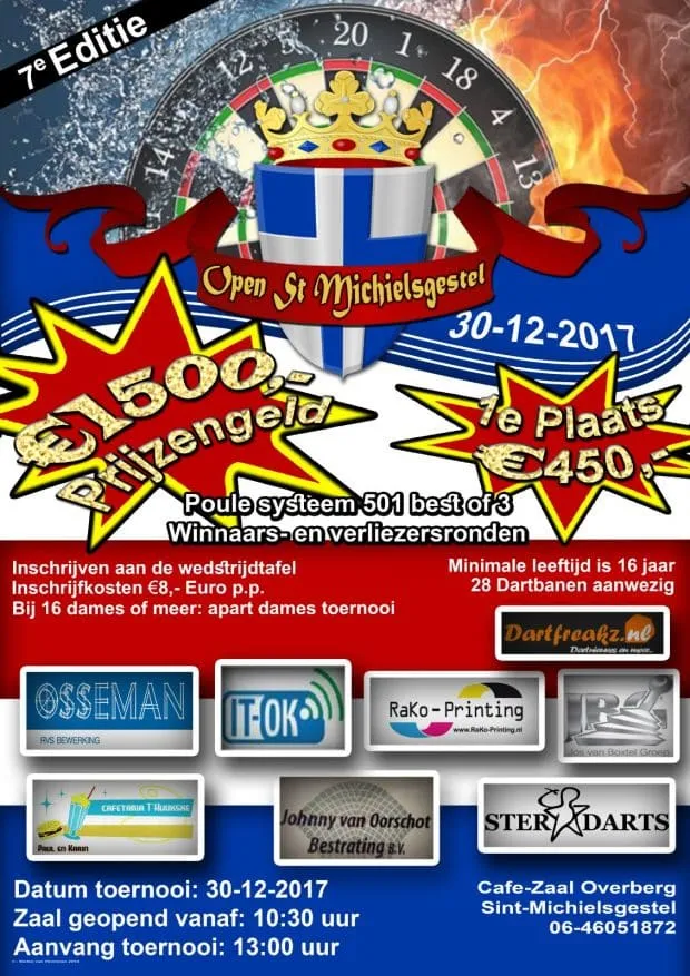 Volgende week zaterdag 30 december 2017 staat alweer de 7de editie van DE afsluiter van het dartjaar, Open St. Michielsgestel op het programma. Met eerdere winnaars als Benito v.d. Pas,
