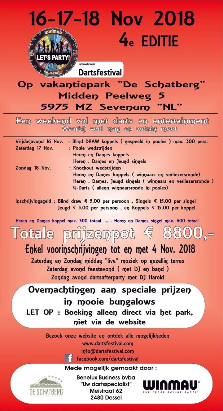 Dit bericht is voor alle deelnemers voor het Darts Festival Sevenum in 2018. In het weekend van 16 tot en met 18 november is Vakantiepark De Schatberg voor het vierde jaar drie dagen lang het decor van een groot dartsfeest. Hieronder valt te lezen waar het reglement te vinden is, zodat het toernooi in goede banen geleid kan worden. Ook valt er te lezen wanneer en waar de loting te vinden is.