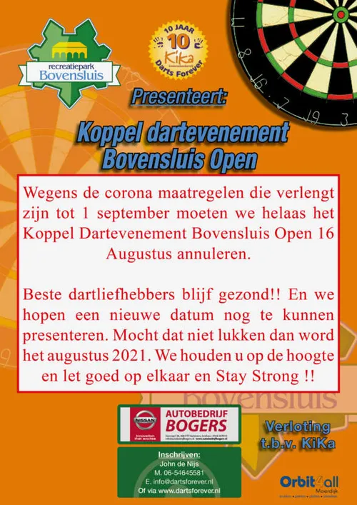 Het Bovensluis Open 2020 zal vanwege het Corona-virus ook geen doorgang vinden. De organisatie heeft middels onderstaand bericht laten weten dat ze het toernooi in augustus 2021 weer hopen te organiseren.