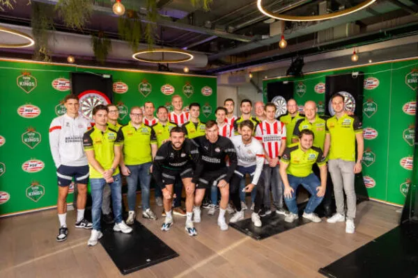 Michael van Gerwen van de TOTO Dart Kings streed samen met PSV-spelers Marco van Ginkel, Guus Til, Joël Drommel, Mauro Junior, Joey Veerman, Kjell Peersman en Phillipp Max en vijftien gelukkige supporters om de titel ‘Clash of Kings’. Team PSV heeft uiteindelijk na een verrassende strijd het team van de TOTO Dart Kings verslagen.