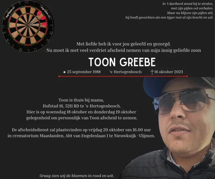 In 2017 sloeg het noodlot toe en moest hij een amputatie ondergaan, de Brabander bleef knokken en stond weer met prothese aan de oche. Waarna hij zelfs in 2019 het Polish open won. Het zat Greebe niet mee en hij kreeg nierfalen en meer en meer problemen met de bloedvaten waardoor vorig jaar ook een amputatie moest ondergaan aan het andere been. Het darttalent heeft gevochten als een leeuw maar kon deze strijd niet winnen waarna Toon Greebe op 35-jarige leeftijd op maandag 16 oktober 2023 thuis is overleden. Vandaag donderdag is er nog gelegenheid persoonlijk afscheid te nemen van Toon die bij zijn moeder thuis is.