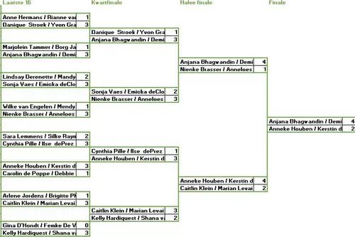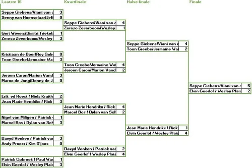 Het broertje van Dimitri van den Bergh was samen met Seppe Giebens te sterk voor o.a. Toon Greebe/Jermaine Wattimena (4-2), Zereso Zeverboom/Wesley van Beekum (4-1), Senny van Hoenselaar/Jeffrey van Leeuwen (3-0) en Dennis Schulten/Wilco van Vulpen (3-2).