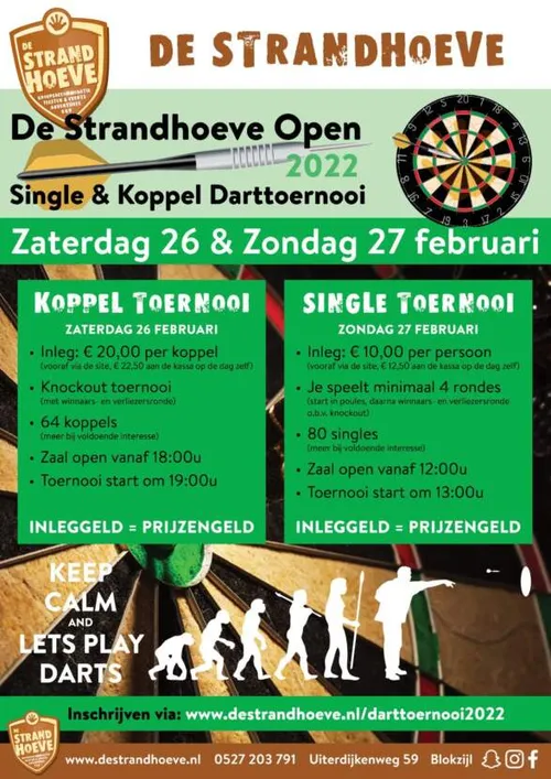 In de kop van Overijssel zal het laatste weekend van februari bol staan van darts. In de Strandhoeve in Blokzijl wordt het gehouden. Op zaterdagavond gaan 64 koppels de strijd aan met elkaar vanaf 19 uur, de zaal is open vanaf 18:00 uur.