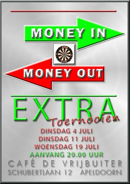 Het competitie seizoen zit er op, in Apeldoorn zorgen ze ervoor dat je pijlen niet gaan roesten. Afgelopen dinsdag begon in de Vrijbuiter een reeks extra Money In = Money Out toernooien in Café de Vrijbuiter. Verveel jij je omdat het competitie seizoen is afgelopen? Dan zien we je graag dinsdag om 20.00 uur in Café de Vrijbuiter.