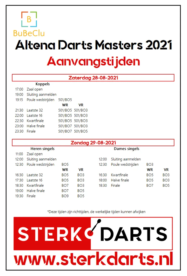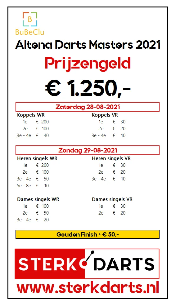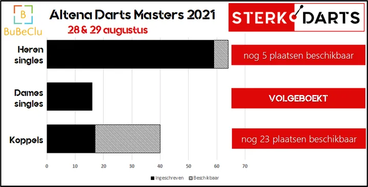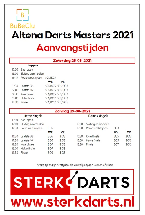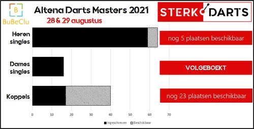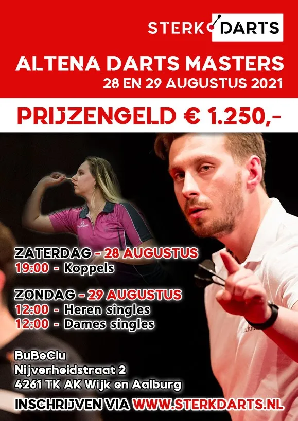 Dit weekend staat de Altena Darts Masters 2021 op het programma. Op zaterdagavond wordt om 19:00 begonnen met een koppeltoernooi. Inschrijven daarvoor is nog mogelijk, ook aan de wedstrijdtafel op de speeldag zelf.