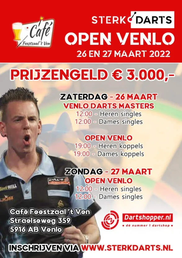 SterkDarts caravaan strijkt vanaf zaterdagmiddag neer om allereerst te spelen in de categorieën heren singles en dames singles om de titels Venlo Darts Masters 2022. Op zaterdagavond de heren koppels en dames koppels van het Open Venlo. En op zondagmiddag worden de ere titels Open Venlo 2022 verdeelt bij de heren en dames. Een totale prijzenpot van € 3.000,- is beschikbaar voor het gehele weekend.