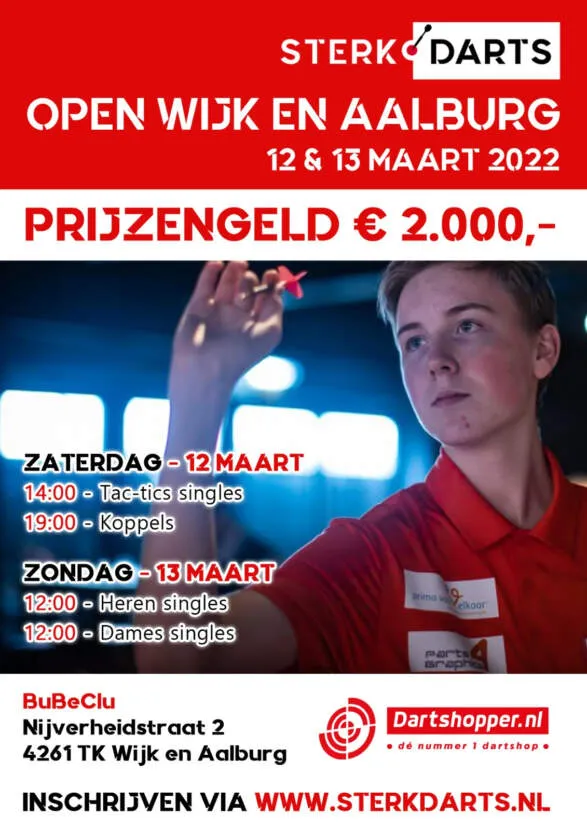 SterkDarts agenda, namelijk op 12 en 13 maart 2022. Het schema is ongewijzigd gebleven. Op zaterdagmiddag wordt een Tac-tics singletoernooi gehouden, gevolgd door een koppeltoernooi op de zaterdagavond. Op zondag strijden de heren en dames om de singletitels.