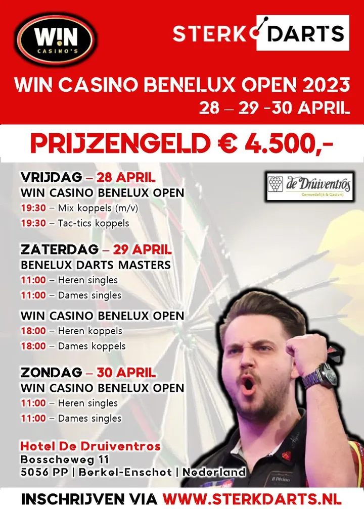 Van 28 t/m 30 april wordt er in Hotel De Druiventros te Berkel-Enschot tijdens het WIN Casino Benelux Open 2023 gestreden om een prijzenpot van € 4.500,-
