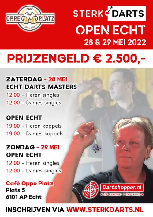 Op zaterdagmiddag 28 mei beginnen we met de Echt Darts Masters 2022: een heren single en dames singletoernooi. Op zaterdagavond start het Open Echt en vinden de heren koppels en dames koppels plaats. Op zondagmiddag 29 mei zijn de titels te verdelen van het Open Echt 2022, een heren singeltoernooi en dames singletoernooi.