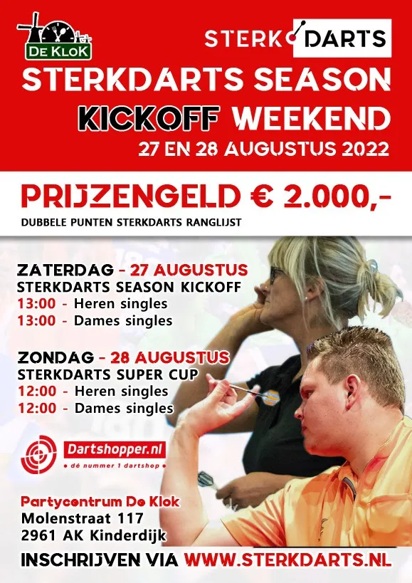 Net als vorig jaar zal het SterkDarts seizoen gaan starten in de De Klok te Kinderdijk. Op 27 en 28 augustus wordt het SterkDarts Season Kick-off Weekend gehouden, mét dubbele punten voor de Ranglijst. Het komend jaar gaan we het hele jaar door, zo gaan we naar Zeeland, Limburg, Friesland, Overijssel, Drenthe, Noord-Brabant en maken we waarschijnlijk een aantal uitstapjes naar België, maar de start en eind van het seizoen liggen in Kinderdijk in De Klok.