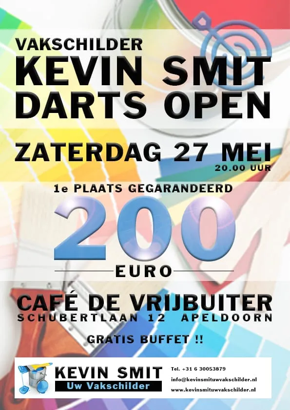 Op zaterdag staat het Kevin Smit VakSchilder Darts Open op het programma. Een gegarandeerde hoofdprijs van 200 euro ligt klaar voor de winnaar. Aanvang is 20.00 uur en het maximaal aantal deelnemers is 64. Alvast inschrijven? Dat kan op 06-51967280.