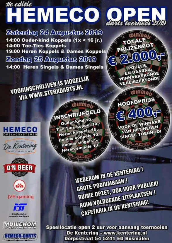 Het wordt alweer de 11e editie van het succesvolle Hemeco Open Dartstoernooi. Het evenement gaat plaats vinden in het weekeinde van 24 en 25 augustus en net als vorig jaar wordt De Kentering weer de locatie. Verdeeld over 2 dagen zullen darters in de categorieën Koppel-TacTics, Ouder-Kind-toernooi, Dames-koppel, Heren-koppel, Dames-singel en Heren-singels een letterlijke gooi doen naar de prijzen.