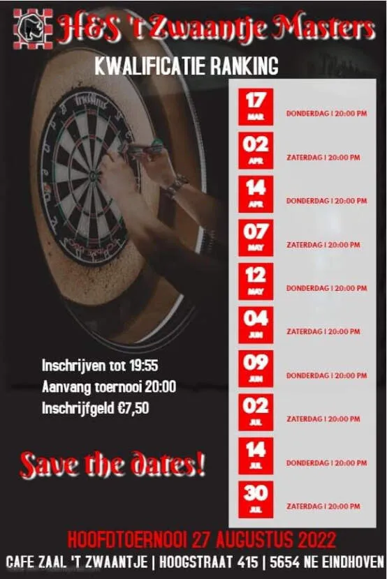 Na ongeveer twee jaar stil te hebben gelegen, kunnen we eindelijk weer van start met de 5e zwaantje masters editie. Dit jaar gaan we weer een ranking gooien om je te plaatsen voor het hoofdtoernooi op zaterdag 27 augustus 2022. Wil jij het opnemen tegen bekende nationale en internationale darters?