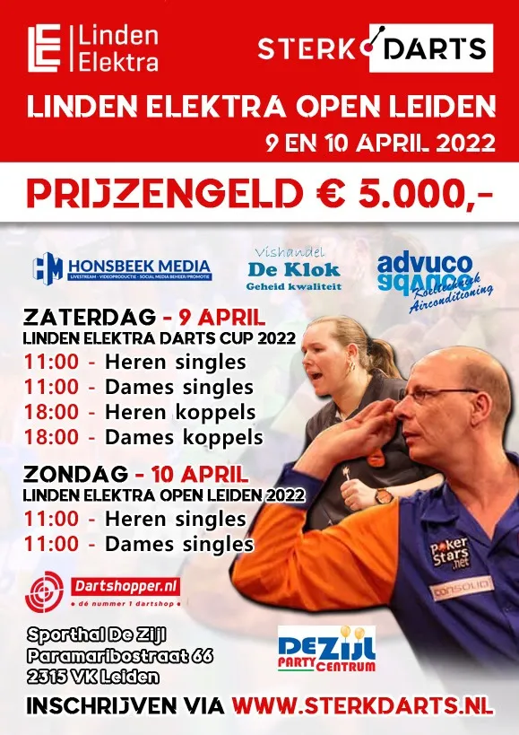 Op 9 en 10 april 2022 staat in sporthal De Zijl het Linden Elektra Open Leiden 2022 op de dartskalender. Op zaterdagmiddag vinden een herensingletoernooi en damessingletoernooi plaats voor de Linden Elektra Darts Cup 2022. Op zaterdagavond strijden de herenkoppels en dameskoppels om de titels. Op zondagmiddag gaan 300 deelnemers uitmaken wie zich mag kronen tot winnaar Linden Elektra Open Leiden 2022. Onder de deelnemers bevinden zich Co Stompé en