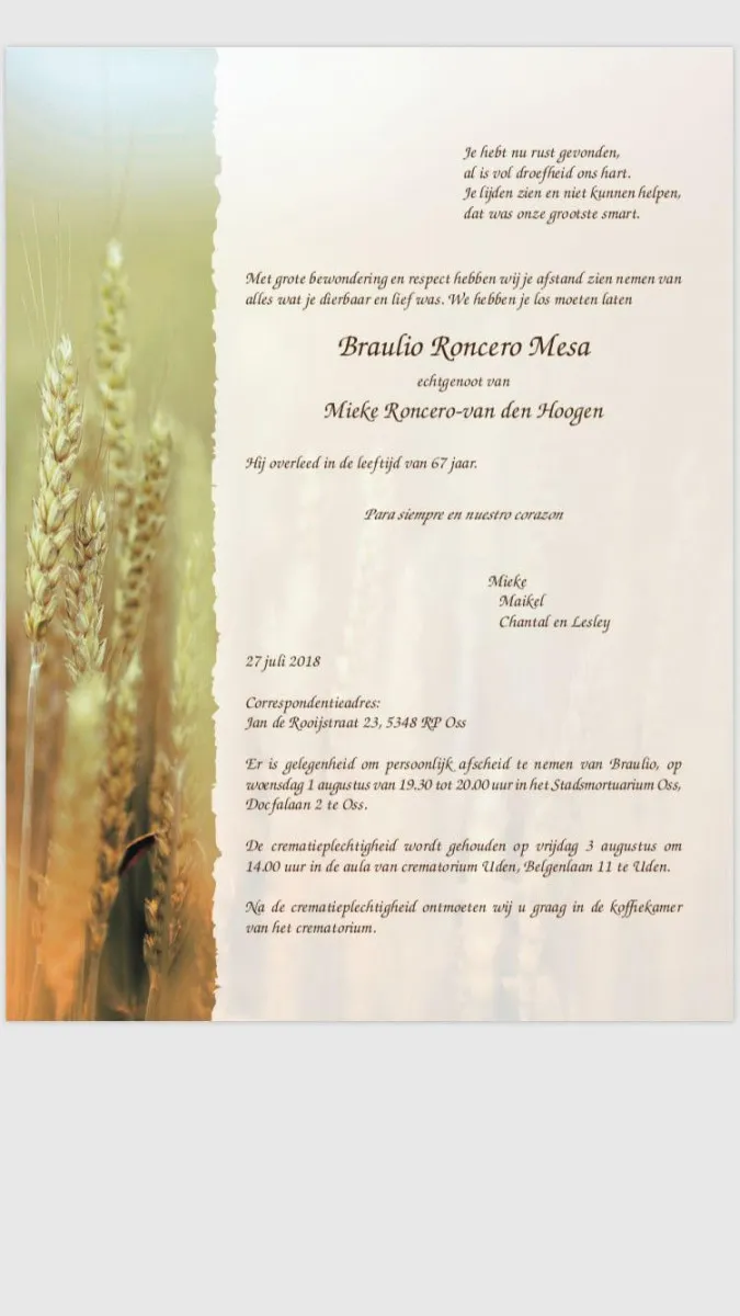 Op verzoek van de nabestaanden plaatsen we hierbij een artikel met de rouwkaart van Braulio Roncero Mesa. is de goedlachse Spanjaard op 67-jarige leeftijd overleden. Braulio was al geruime tijd ziek en verscheen niet meer op de diverse toernooien.