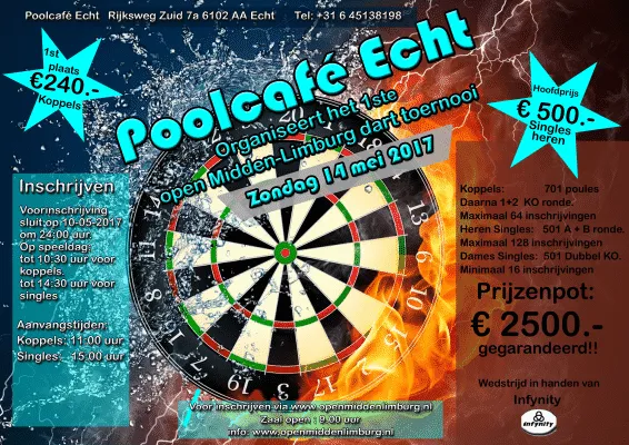 Op Zondag 14 Mei vind dit toernooi plaats in de mooie zaal van het Poolcafé te Echt. Er zal worden gespeeld op 3 vaste dartbanen en 16 dartbanen die geplaatst worden door Jelti Darts. De wedstijdleiding is in handen is van Infynity.