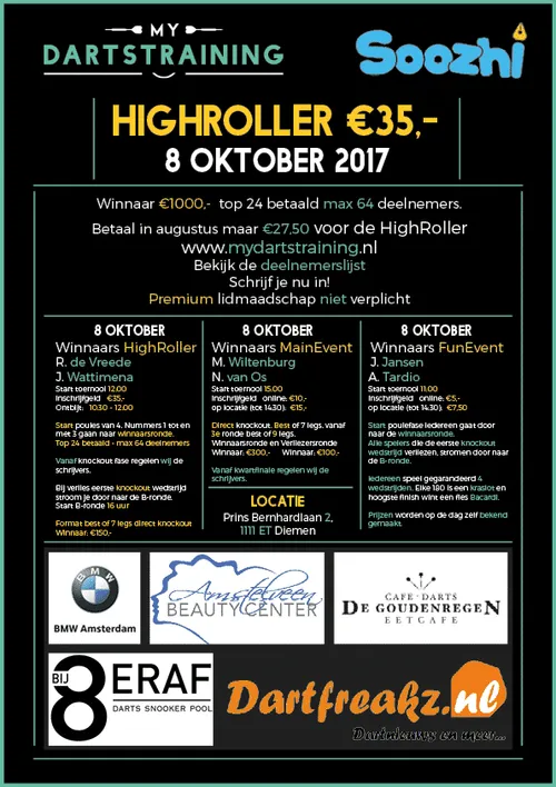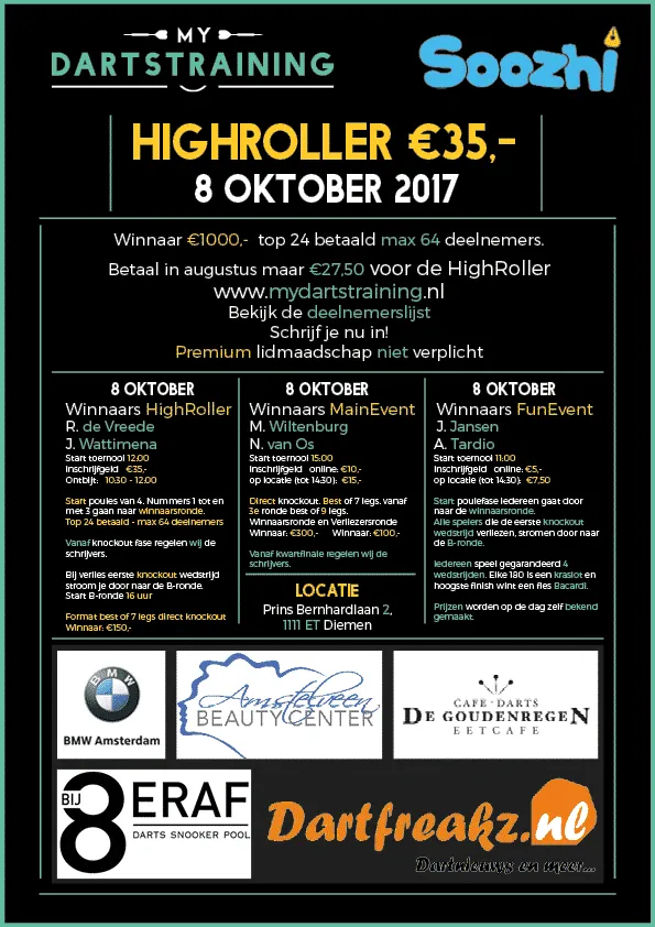 Om 12:00 uur begint het echte werk. Dan gaat de Highroller van start! Mydartstraining heeft al twee keer een dergelijk toernooi georganiseerd. Beide keren was het niveau bijzonder hoog. Spelers die meedoen aan de HighRoller worden extra in de watten gelegd doordat verschillende aspecten aan het toernooi zijn toegevoegd Je betaalt weliswaar €35,- inschrijfgeld, maar krijgt hiervoor meer dan waar voor je geld. Zo is er een luxe ontbijt geregeld voor aanvang van het toernooi, wordt er in poulefases gestart, krijgt maar liefst 37,5% van de spelers prijzengeld en hoef je niet te schrijven vanaf de knock-outfase. Ook maken wij het spelformat per ronde steeds langer. Wanneer je je eerste knock-outwedstrijd verliest, stroom je door naar de B-ronde van de Highroller. Hier speelt iedereen die de eerste knock-outwedstrijd heeft verloren in een nieuw toernooi voor prijzengeld. Speelplezier is dus gegarandeerd bij het HighRoller toernooi. And last but not least: de winnaar van de HighRoller wint maar liefst €1000,- !