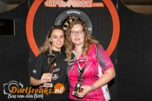 Sharona geeft in deze thuiswedstrijd (zij speelt bij de Rivierenland Darts Bond, red.) direct haar visitekaartje af met een 120-finish. Aileen forceert echter een break voor 3-2 en deelt vervolgens met een 106-finish voor 4-2 de genadeklap uit.