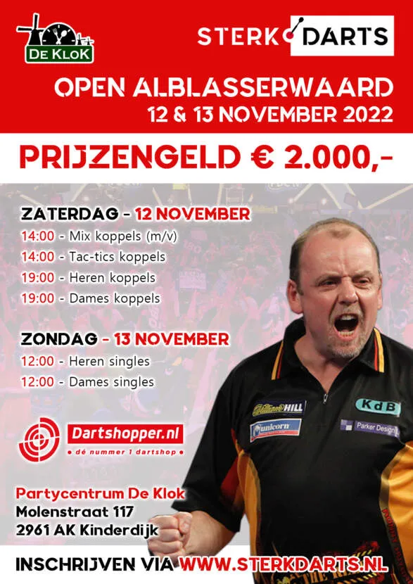 Informatie over het Open Alblasserwaard 2022 Het prestigieuze Open Alblasserwaard is het oudste SterkDarts toernooi op de agenda. Dit jaar is het toernooi in De Klok toe aan zijn dertiende editie. Op 12 en 13 november 2022 wordt er wederom in 6 categorieën gestreden om de titels. Op zondag 13 november strijden de heren singels en dames singels om de winst. Op zaterdagavond 12 november worden de dameskoppels en heren koppels gespeeld. Op zaterdagmiddag vinden weer het Tac-Tics koppeltoernooi en Mix-koppeltoernooi plaats.