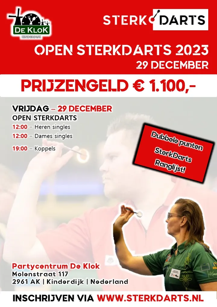 Het jaar sluiten we af op 29 december met het Open SterkDarts. De locatie betreft net als vorig jaar Partycentrum De Klok in Kinderdijk.