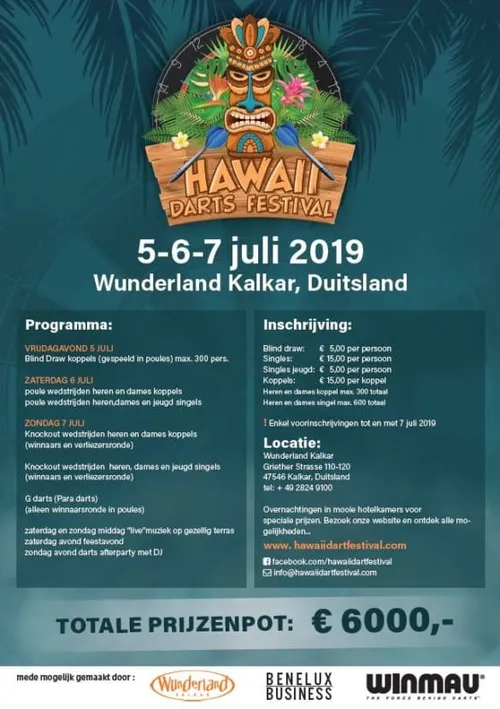 De organisatie achter de en het komt met een gloednieuw toernooi. Het toernooi zal de naam 'Hawaii Dartsfestival' krijgen. Het zal in het weekend van 5 juli tot en met 7 juli 2019 worden gespeeld in attractiepark- en evenementencomplex Wunderland in Kalkar te Duitsland. Eerder dit jaar werd hier ook al met succes het Open Duitsland georganiseerd. Het gehele toernooi zal in het teken staan van Hawaii waarbij zowel de zaal als het podium en de aankleding in de sfeer van Hawaii wordt gebracht. Het toernooi zal gelden als een perfecte afsluiting van het dartseizoen zijn en een start van de zomer. Meer detail zullen later volgen maar is al te bezoeken en de poster is hieronder te bekijken met het speelprogramma.