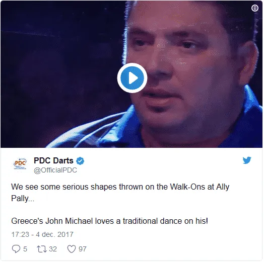 John Michael. Evenals Qiang Sun zal ook hij ontbreken op de aanstaande editie en dus des te meer reden om extra te genieten van deze terugblik. Bij zijn opkomst doet hij de welbekende Griekse 'Sirtaki' en het is hem na te geven dat hij hem beter uitvoert dan de walk-on girls. Bekijk onderstaande beelden waarin hij zijn act opvoert voor een uitverkocht Alexandra Palace.