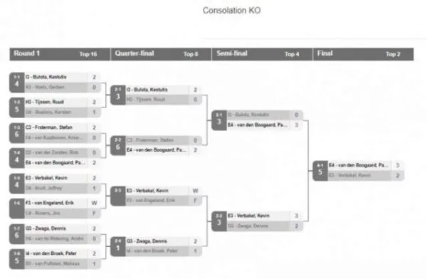 Tegelijkertijd werd op een aantal andere dartbanen de verliezersronde/herkansing/strijd om de troostprijs gespeeld waarbij Patrick van den Boogaard en Kevin Verbakel de finale wisten te halen. De winst ging hier naar Patrick;