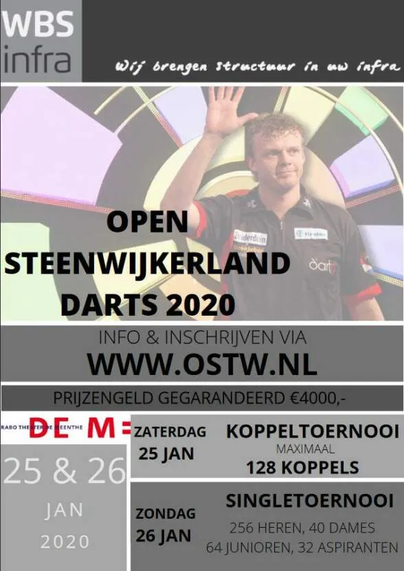 In het weekend van 25 en 26 januari 2020 zal de Meenthe weer omgetoverd worden tot darts tempel. De 14e editie van het WBS-infra Open Steenwijkerland 2020 zal weer plaatsvinden in het weekend voor de Dutch Open. Ideaal als opwarmer voor het wereldtoernooi in Assen.