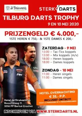 Twee weken geleden maakte SterkDarts een nieuw groots dartsweekend bekend: de Tilburg Darts Trophy 2020. In slechts 14 dagen zijn alle categorieën volledig volgeboekt. Maar liefst 208 herensingels, 48 damessingels, 40 mixkoppels, 32 tac-tics koppels, 20 dameskoppels en 100 herenkoppels gaan in Hotel De Druiventros de strijd met elkaar aan.