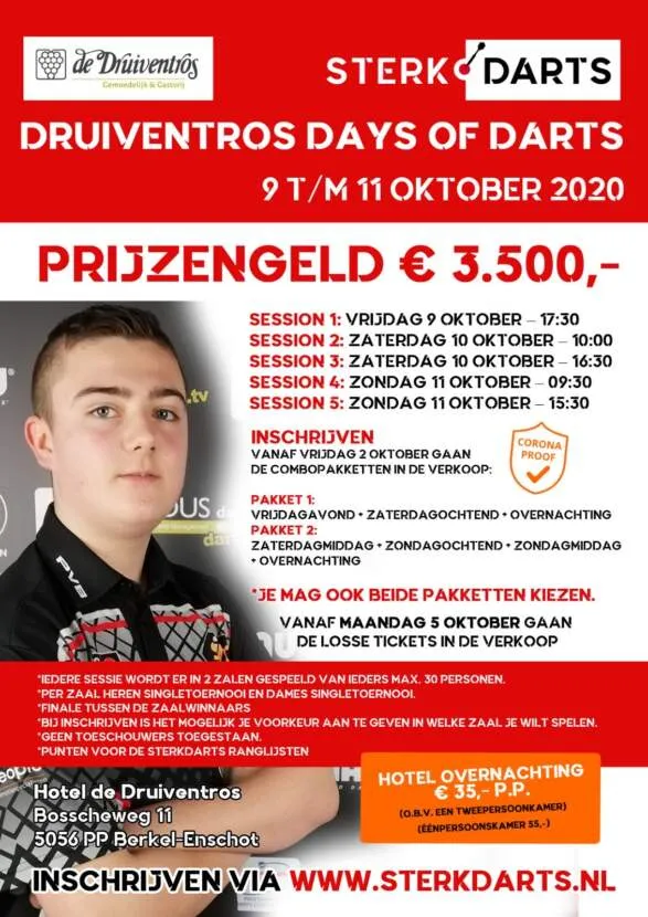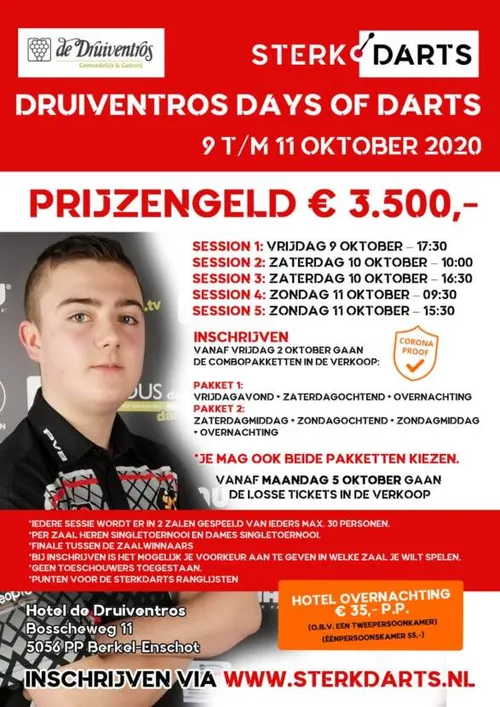 Druiventros Days of Darts 2021 9 t/m 11 oktober 2021 Prijzengeld € 3.500,- Session 1: Vrijdag 9 oktober – 17:30
